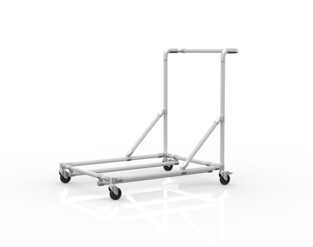 A handling chassis with a handle made from a tubular system is suitable for various handling purposes in warehouses and workshops. The chassis includes 2 swivel casters with brakes and 2 swivel casters without brakes, with a diameter of 75 mm, allowing easy handling of items. The internal dimension is designed for 2 boxes measuring 600 x 400 mm. Dimensions are 878 x 678 x 900 mm.