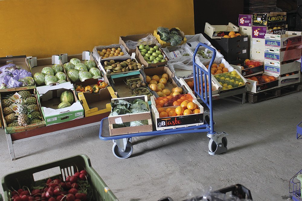 The lifting loading area of ​​the truck saves up to 60% of storage space. Welded robust construction made of steel pipes and profiles. Color blue RAL 5010. Storage surface MDF board with beech decor, width 1030 mm, depth 700 mm. Highly durable thermoplastic castors with ball bearing (2 swivel with brake, 2 fixed). Weight 35.5 kg, load capacity 500 kg.