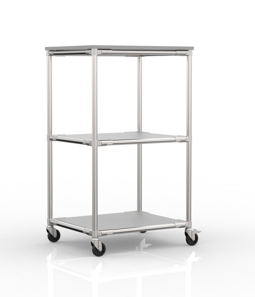 Shelving trolley made of tubular modular system suitable for industrial premises, warehouses and production halls. Suitable for transporting goods and materials. 18 mm thick laminate board, trolley load capacity 150 kg, floor load capacity 50 kg.