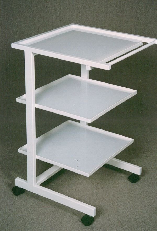 Transportable side table lacquered, stainless steel storage surfaces, one drawer. Two braked and two non-braked castors, suitable for storage and delivery of surgical instruments and medical supplies. Height 850 x width 640 x depth 480 mm. The color of the structure is white.