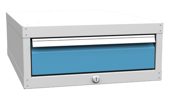 Hanging desk drawer container, width 500, height 212, depth 700 mm. 1 x socket 120 mm. Body color RAL 7035 light gray. In stock in the drawer color blue.