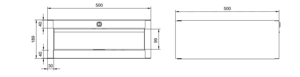 Hanging desk drawer container, width 500, height 189, depth 500 mm. 1 x socket 99 mm. Body color RAL 7035 light gray.