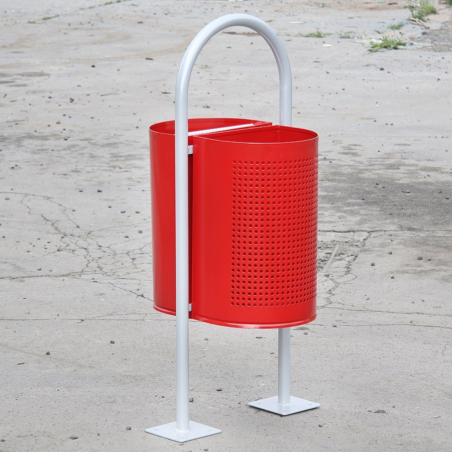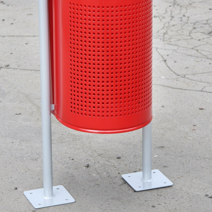 Hanging double trash can - solid + perforated, 1 x ashtray. Frame RAL 9006, basket RAL 3000. Dimensions in mm: (H x W x D) 490 x 250 x 330. Total height of the trash can 1100 mm, weight 17 kg. Warranty: 2 years. The price includes the frame and insert.