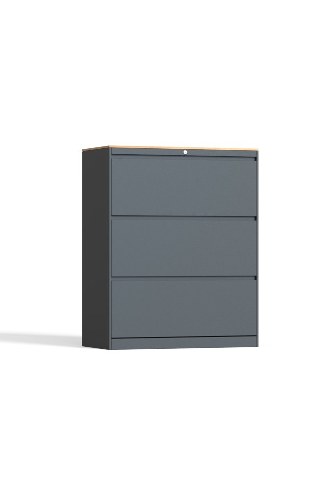 Three-drawer dismantled filing cabinet made of sheet steel 0.6 mm thick. Height 1008 x width 900 x depth 450 mm, central lock, full extension. For documents or hanging boards of A4 format. Color gray/light wood imitation.