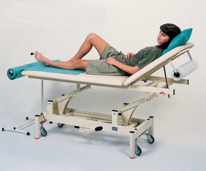 Hydraulically powered GH2 lounger, two-part, height adjustable. The rehabilitation, examination (massage) couch is intended for clinical and physical examination of patients in outpatient clinics, general practitioner and specialist doctors' offices. In rehabilitation facilities, they are used for physiotherapy. It is intended for patients of hospitals, clinics, specialized treatment institutes, spas, homes for the elderly, massage parlors, wellness centers and other facilities under the continuous supervision of medical personnel. The lounger is also suitable for changing rooms and first aid rooms. It can also be used for minor surgical interventions without anesthesia, when the patient is fully conscious.