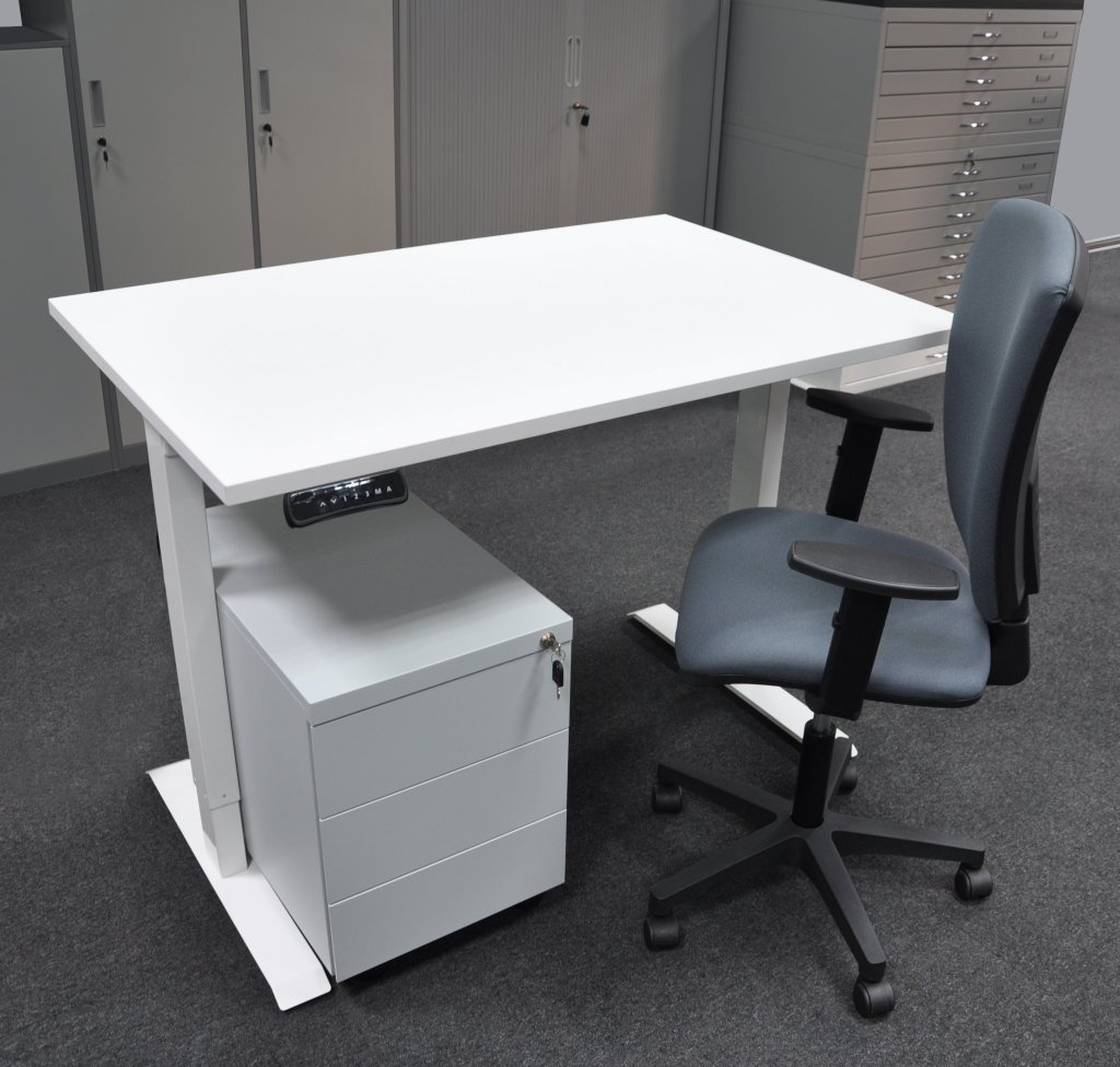 Electrically height-adjustable table with three-drawer container and chair. Chair capacity 120 kg. Worktop height adjustment range 735 – 1235 mm. Table top depth 800 mm. The table allows you to work both standing and sitting, thus preventing back pain when sitting for a long time. Several patterns of worktops to choose from, white base.