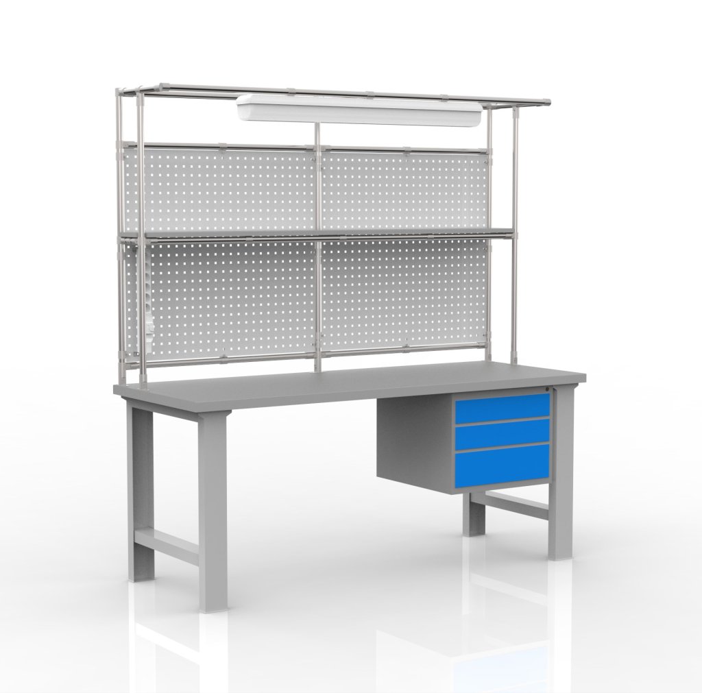 Height-adjustable workshop table with a tubular system top section. The table includes a worktop made of beech jointed board, an under-mount container with three drawers, a perforated panel for hanging boxes or tools, a shelf made of laminated board, a socket with a switch, and LED lighting. The height of the work surface is adjustable between 830 - 1070 mm. Load capacity under uniform load is 300 kg, shelf load capacity is 30 kg. Dimensions are 2080 x 2000 x 750 mm.