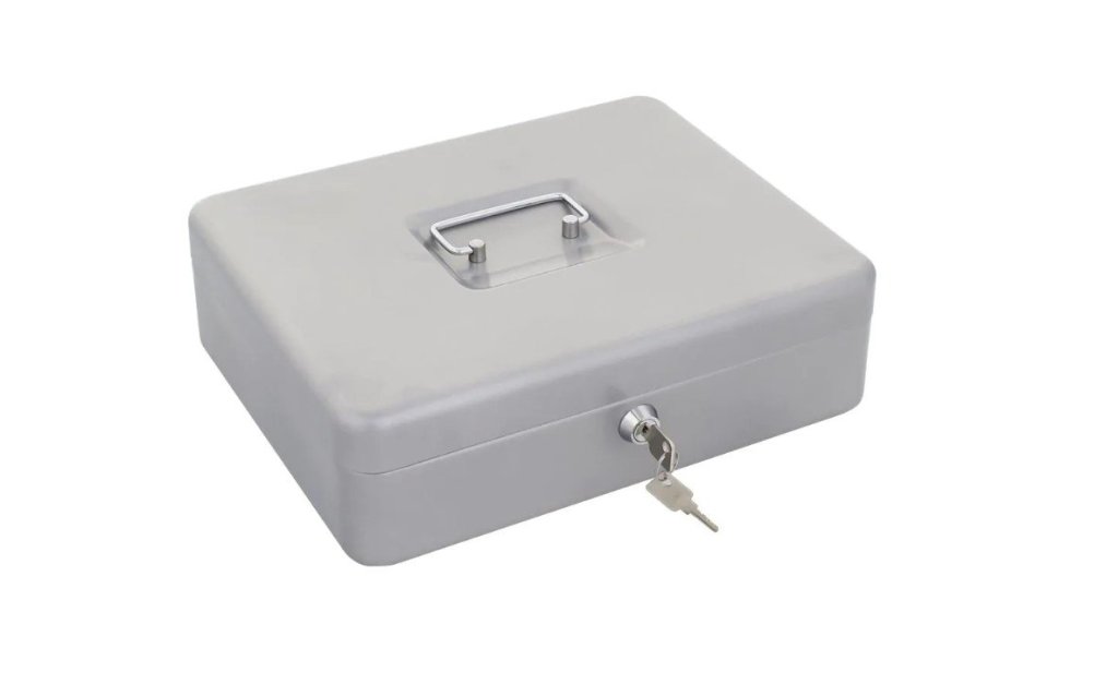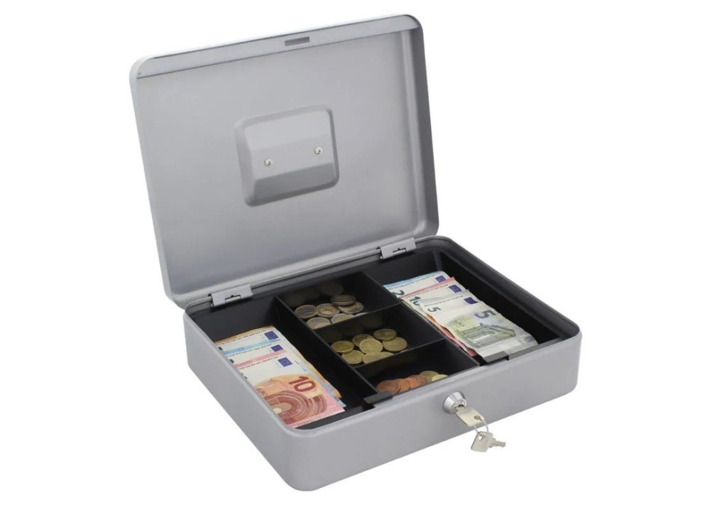 Hand-held cash register with insert for coins and banknotes. Key locking.