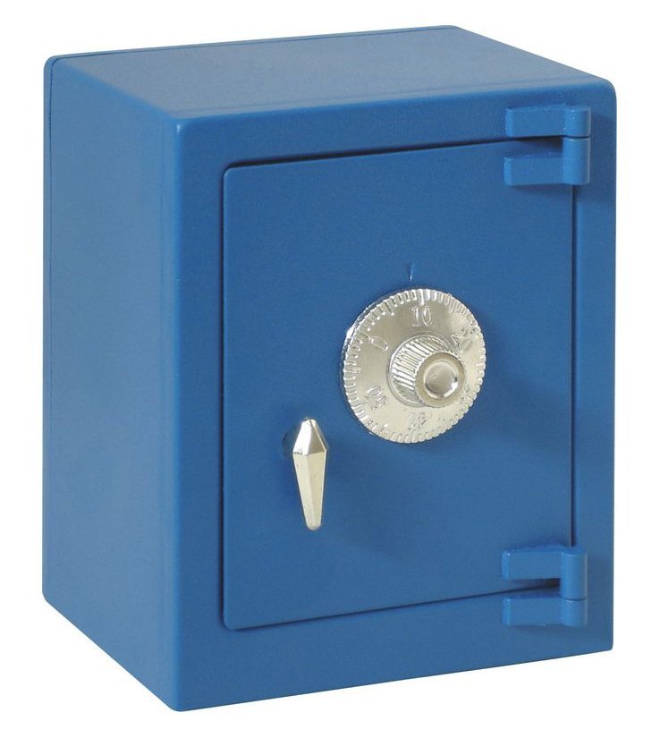 Huchas blue cash box, height 132 x width 110 x depth 80 mm, mechanical code locking, coin slot from the back. Each cash box has full description and parameters