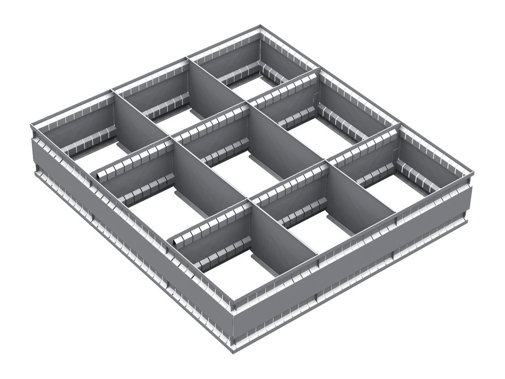 Internal division of VND EPV 12B sockets. Installation is possible in drawers where the height of the drawer front is 120 and 150 mm. Dimensions 95 x 538 x 357 mm.