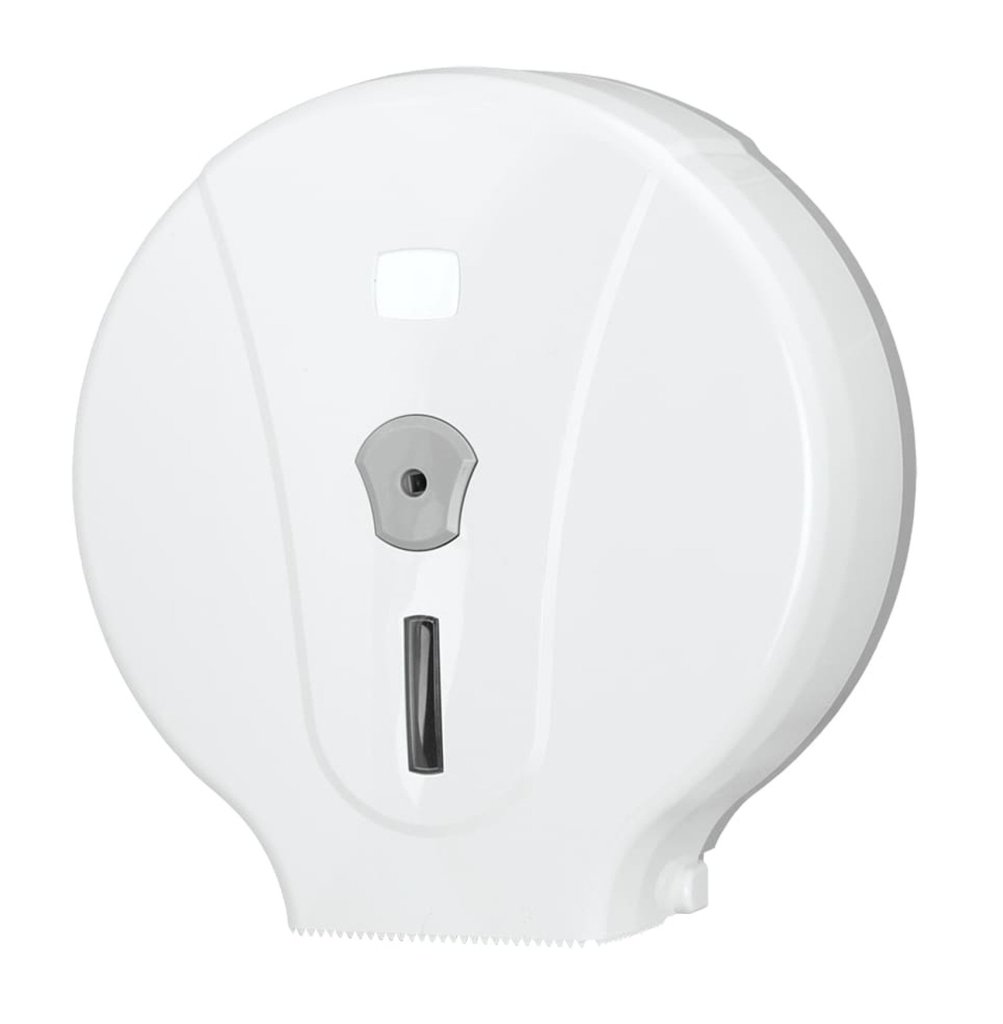 Plastic dispenser for Jumbo Maxi toilet paper (maximum central diameter 29.5 cm). View for checking the paper status, lockable.