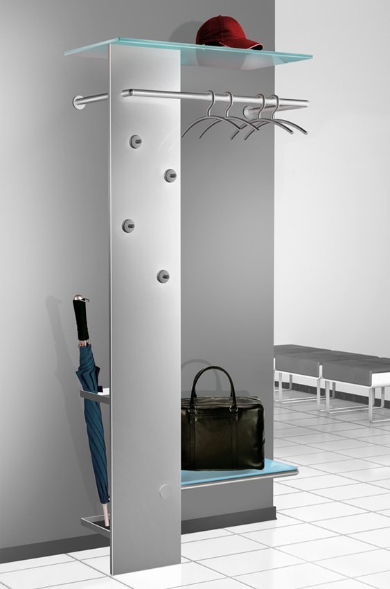 Steel hanger wall in silver color. Hat shelf made of transparent safety glass, 5 hangers, 6 hooks included. Height 1700 mm, width 600 mm, depth (without arms) 330 mm.