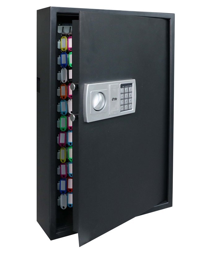 Single-shell cabinet for 144 keys, height 660 x width 430 x depth 100 mm. Electronic code locking, emergency key, color black. Side opening for storing keys when the door is closed.