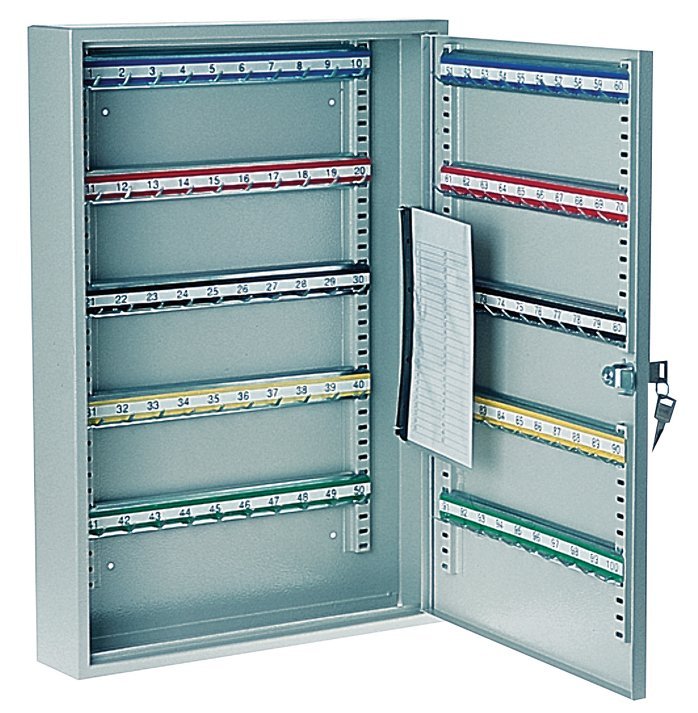 Key box type S 100 for 100 keys. Includes hooks with tags, locking with key. Height 550 mm, width 380 mm, depth 80 mm. Adjustable bars with hooks according to the length of the keys.