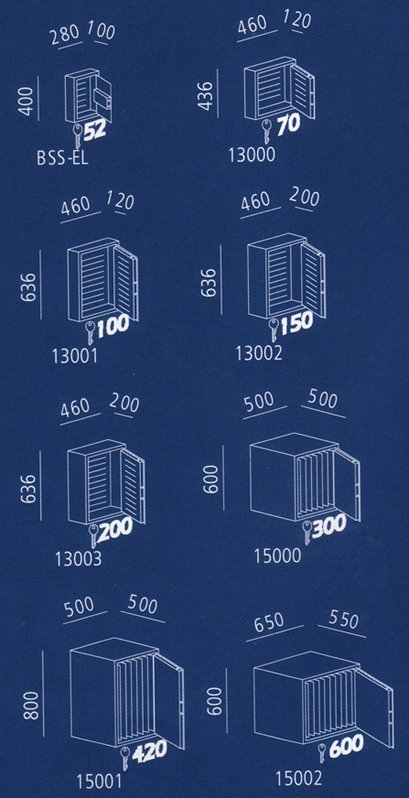 Key Safe 13001. For 100 keys. Dimensions - H 636 x W 460 x D 120 mm. Weight 30 kg. For safe storage of keys in offices, warehouses, hotel facilities, etc. 9 other models to choose from.