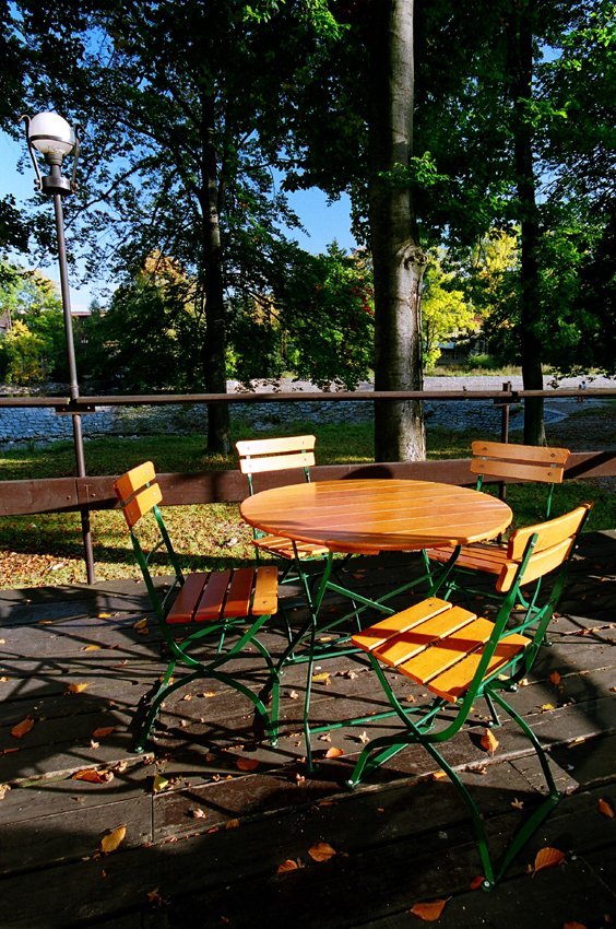 Arnika chair - wooden parts ash, chestnut color. Surface treatment of the metal frame in powder color RAL 6005 green. Chair dimensions (h x w x d): 890 x 400 x 340 mm. Seat height 470 mm. Czech production.