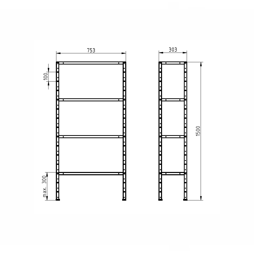 Light metal screw rack intended for wide use, height 1500, width 750, depth 300 mm. The load capacity of the shelf is set to a maximum uniform load of 50 kg and is used for storing lighter objects. The shelves are freely adjustable by 50 mm. Simple assembly using screw connections.