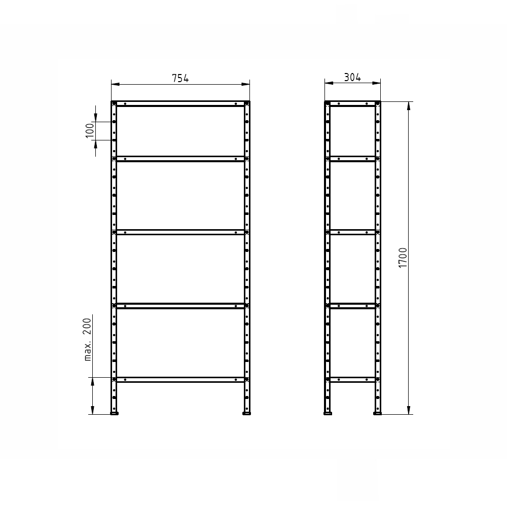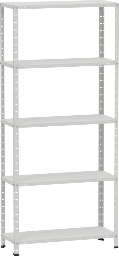 Light metal screw rack intended for wide use, height 1700, width 750, depth 300 mm. The load capacity of the shelf is set to a maximum uniform load of 50 kg and is used for storing lighter objects. The shelves are freely adjustable by 50 mm. Simple assembly using screw connections.