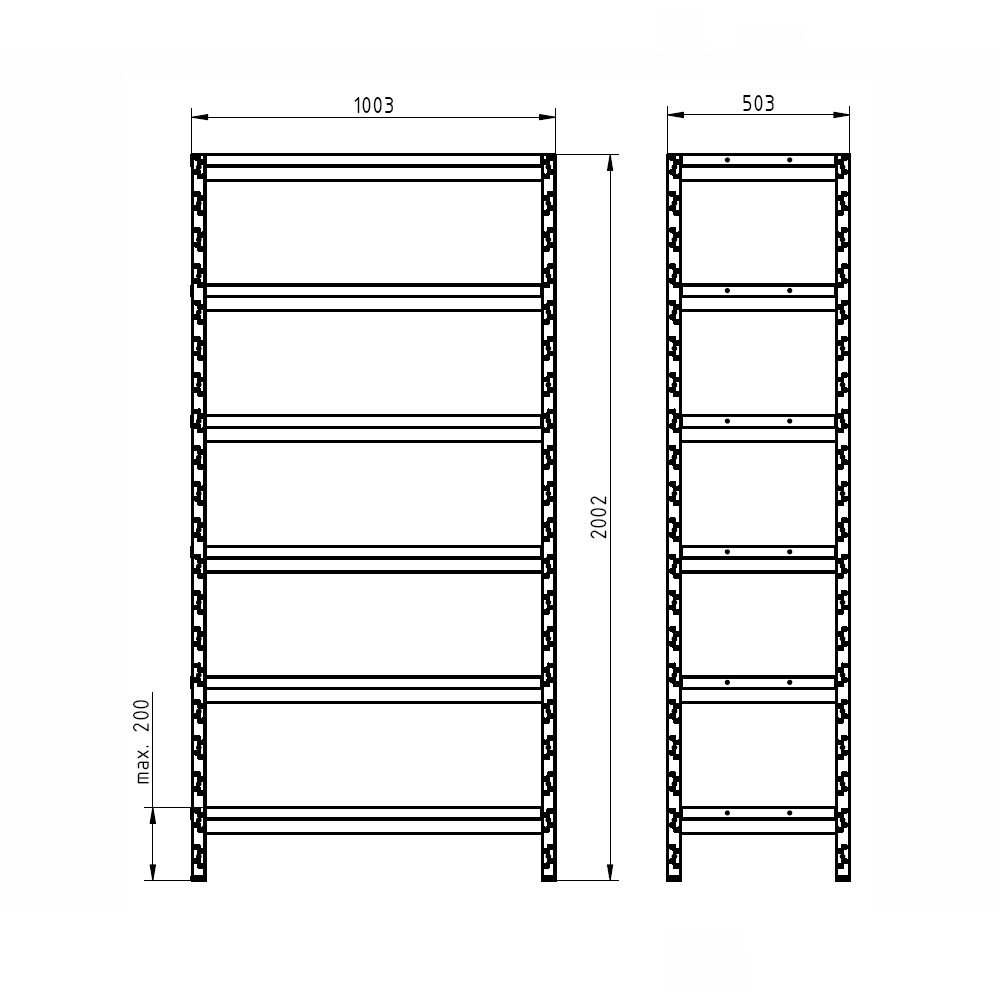 Metal screwless rack intended for wide use. The load capacity of the shelf is set to a maximum uniform load of 175 kg and is used to store medium-heavy objects. Shelf depth 500 mm, width 1000 mm, height 2000 mm, 6 shelves.