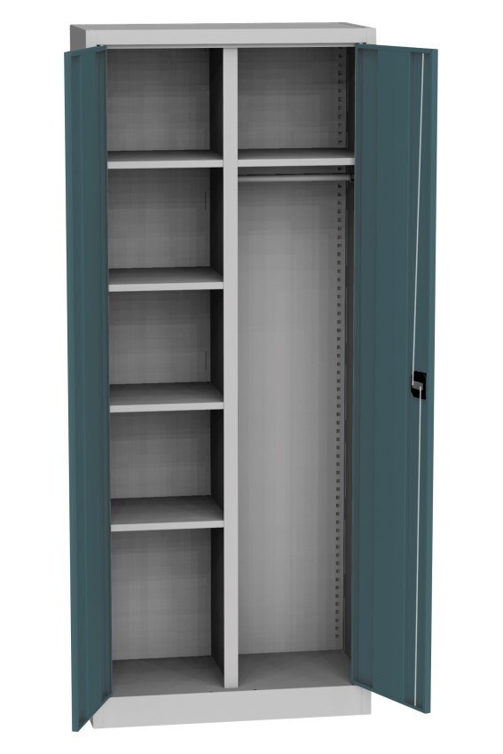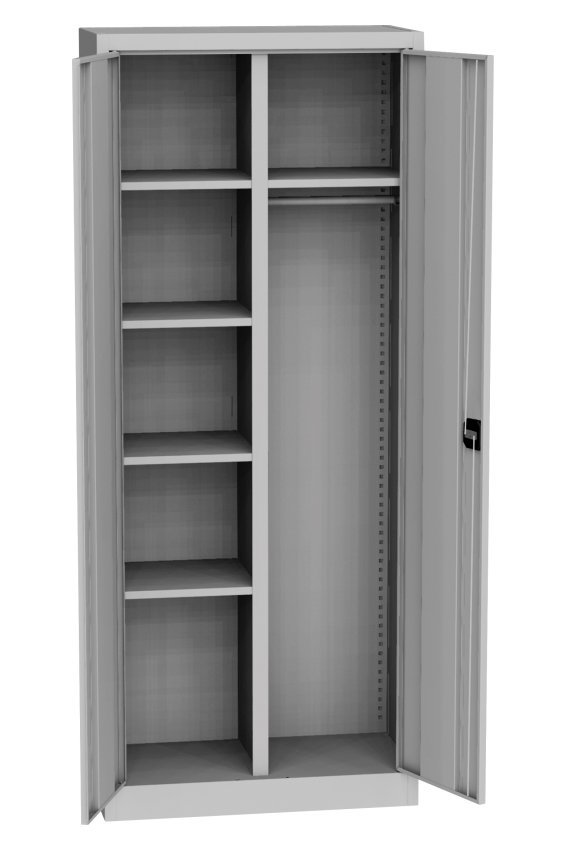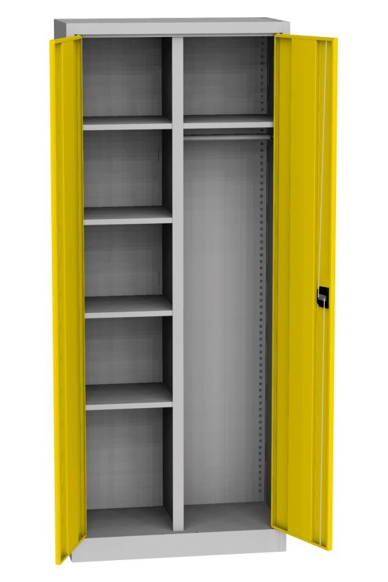 Cabinet with solid doors, height 1950 x width 505 x depth 400 mm. Locking on a cylinder lock with a wheelbase mechanism. 4 x adjustable steel shelves (load capacity 60 kg). The possibility of replacing solid doors with doors with glass filling, with wire filling or laminate doors in the shade of beech, birch or cherry. Body color RAL 7035 light gray.