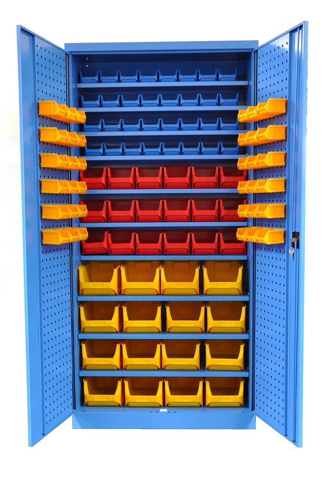 Workshop cabinet with plastic containers. Height 1950 x width 950 x depth 400 mm. More information about plastic boxes in the entire description (see left menu). In stock in cabinet color RAL 5012 blue.