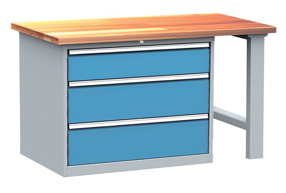 Workshop table, DPS 102 assembly, width 1500, height 850, depth 750 mm. The set consists of a table top made of beech joint 40 mm, a fixed metal leg and a three-drawer container DPK 01A. Drawer capacity 80 kg. In stock in light gray body, blue drawers.
