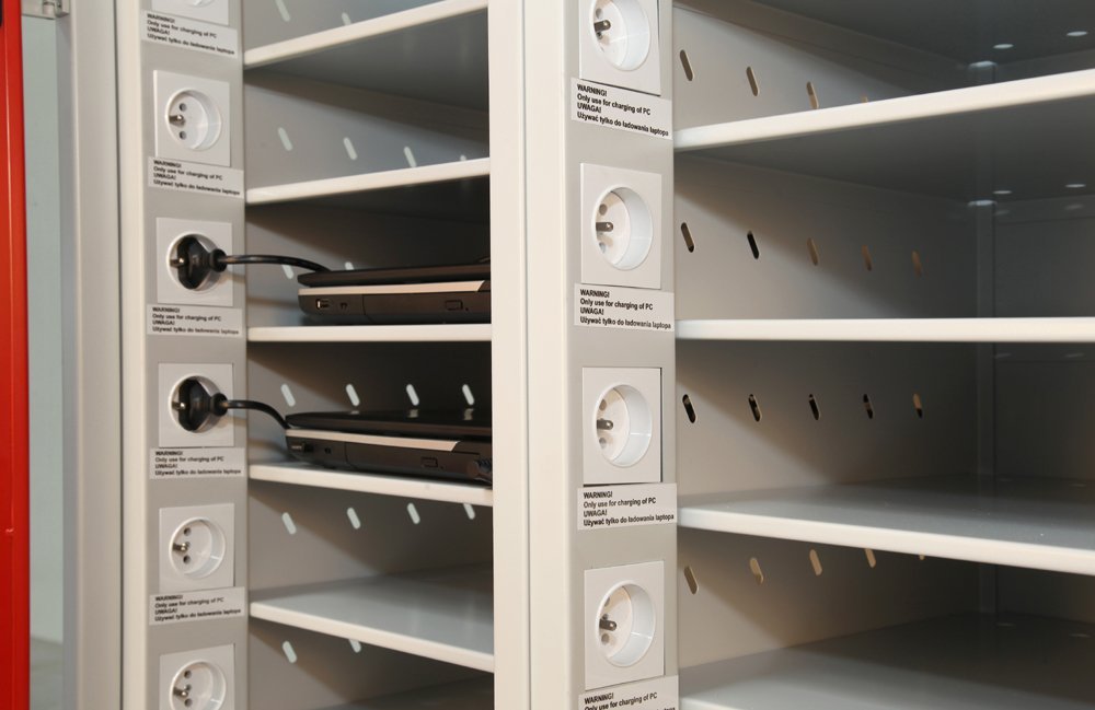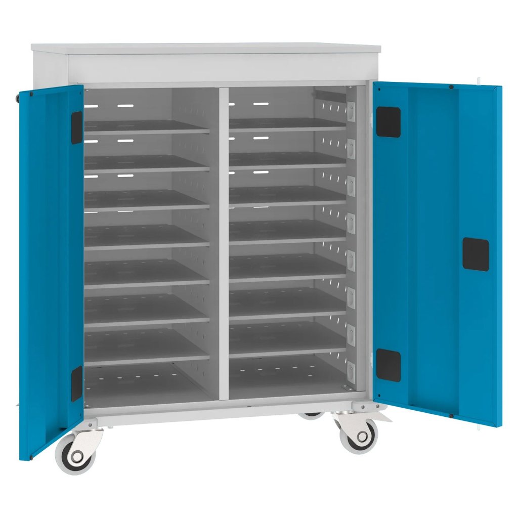 Cart with battery charging function to store and easily transport laptops. Ideal for schools, libraries, conference halls and more. Dimensions in mm (H x W x D) 1060 x 920 x 540.