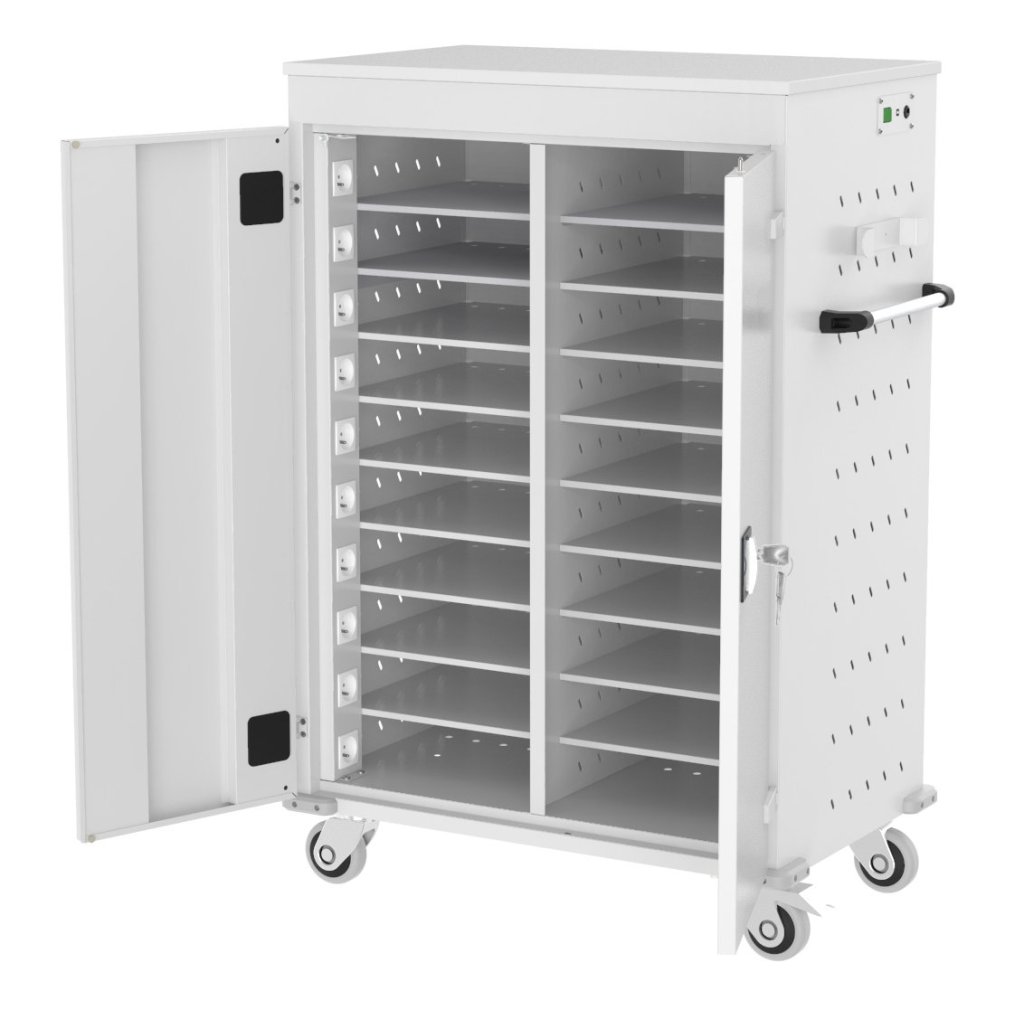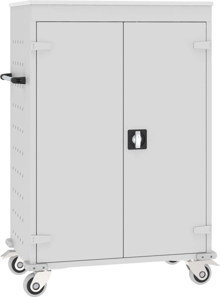Cart with battery charging function to store and easily transport laptops. Ideal for schools, libraries, conference halls and more. Dimensions in mm (H x W x D) 1250 x 530 x 540.