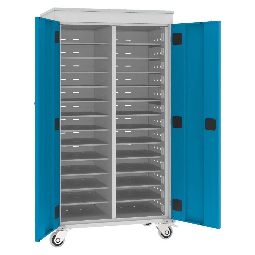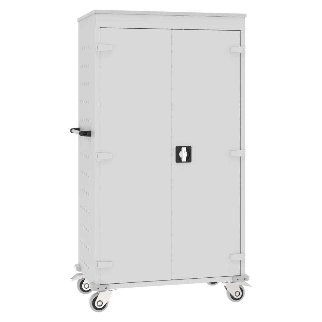 Cart with battery charging function to store and easily transport laptops. Ideal for schools, libraries, conference halls and more. Dimensions in mm (H x W x D) 1540 x 920 x 540.