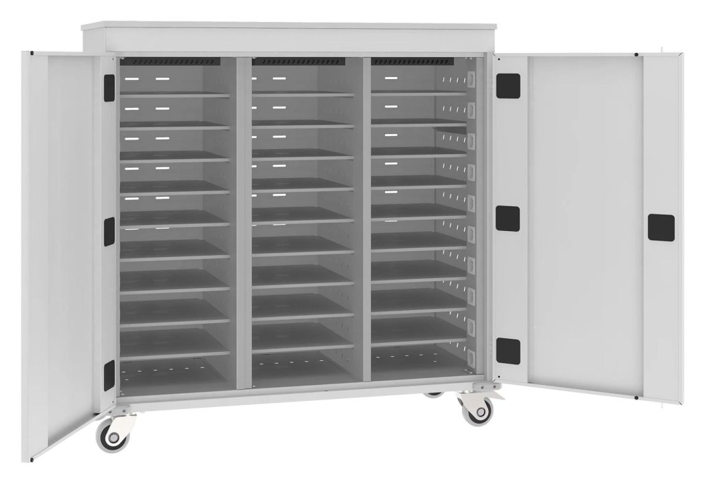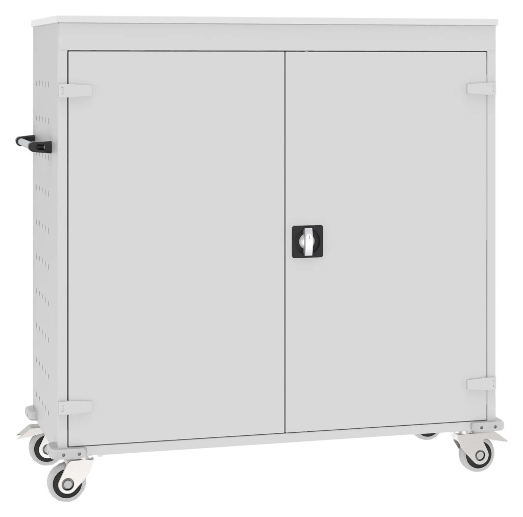 Cart with battery charging function to store and easily transport laptops. Ideal for schools, libraries, conference halls and more. Dimensions in mm (H x W x D) 1250 x 530 x 540.