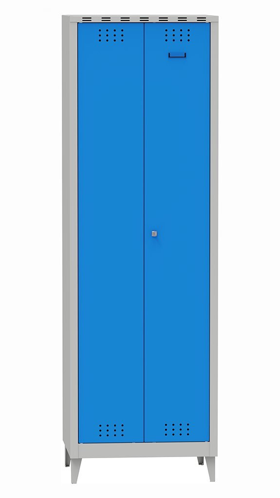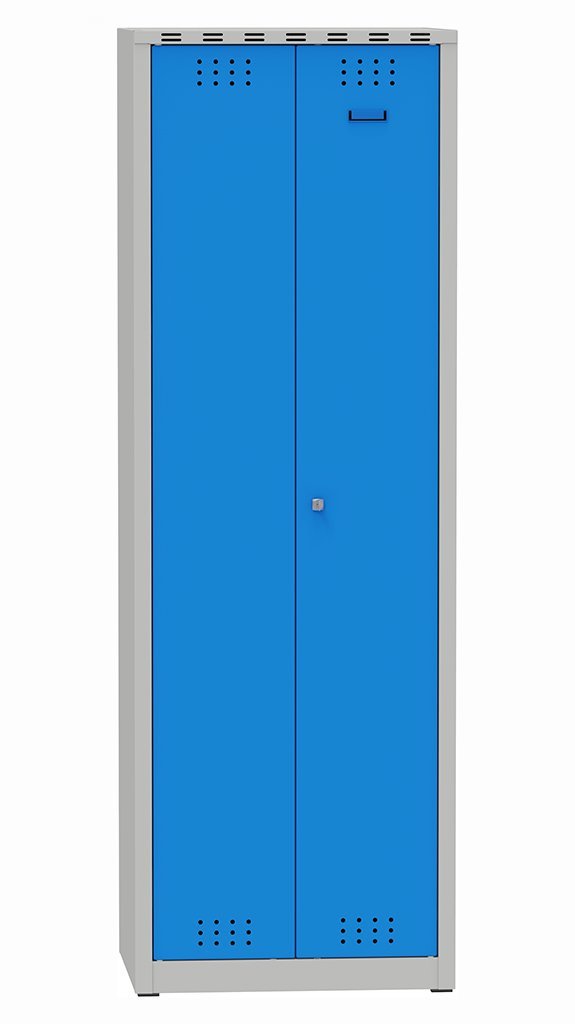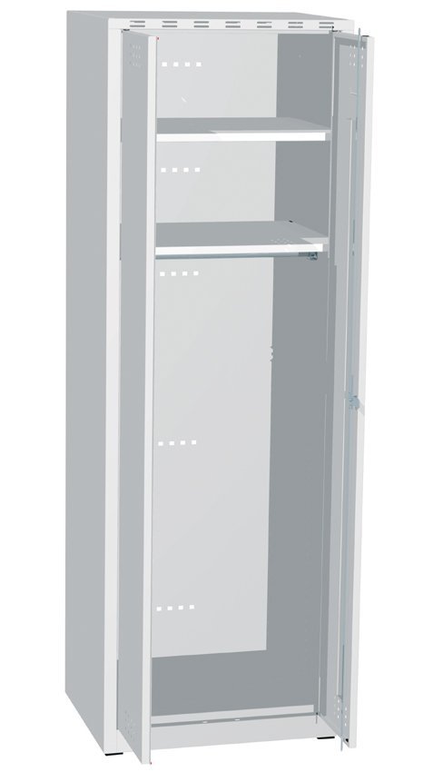Large wardrobe with common door, height 1800 x width 600 x depth 500 mm. The cabinet is equipped with 2 shelves, a rod for hangers with sliding hooks, body color RAL 7035 light gray. Locking with a wheelbase lock.