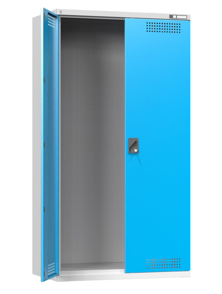 Liquid storage cabinet with swing doors, 25 mm perforations for height adjustment of shelves, full door with reinforcements for perforation, load capacity 600 kg. Height 1950, width 1044, depth 625 mm. The cabinet doors are equipped with ventilation holes. Can be retrofitted with shelves, catch basins and perforated panels. A cabinet for liquids equipped with a 3 mm thick tub allows safe storage of aggressive substances and reduces the risk of their leakage.