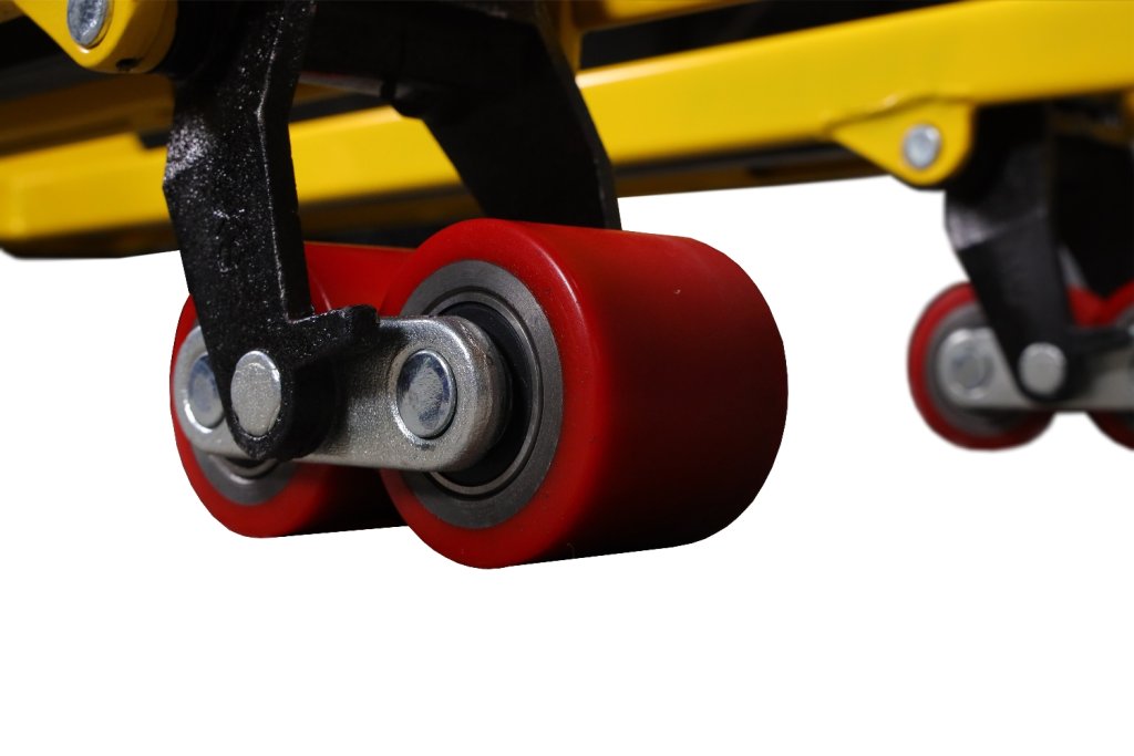 Scissor lift platform equipped with foot-operated hydraulic pump with a capacity of 350 kg and maximum lift height of 900 mm.