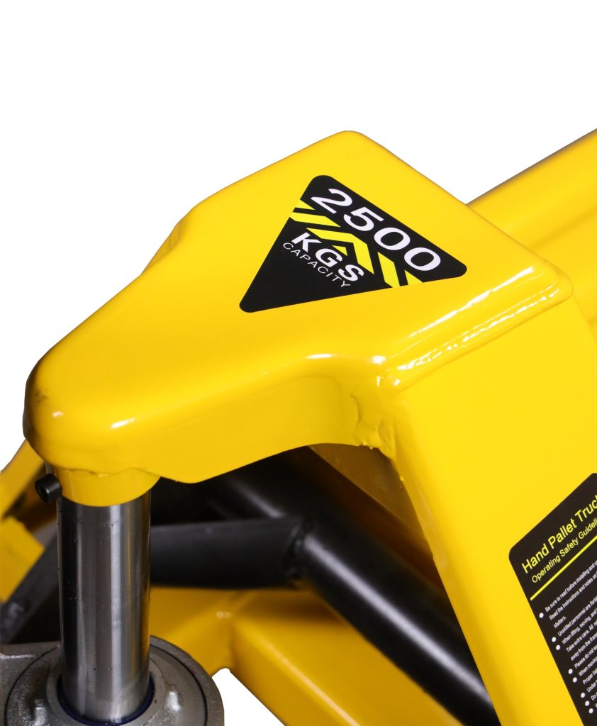 Hand pallet truck, dimensions height 1220 x width 550 x depth 1510 mm, load capacity 2500 kg, fork width 550 mm, fork length 1150 mm.