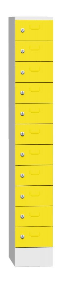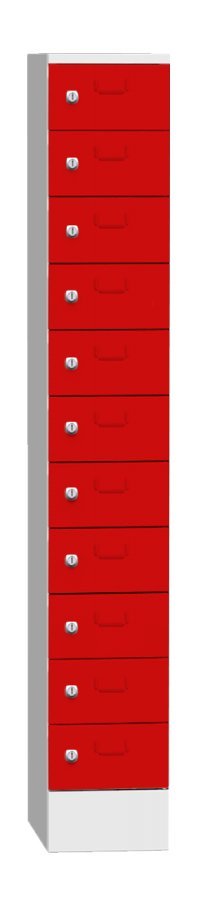 The cabinet is intended for sorting mail, documents or other valuables. Separately lockable boxes for cyl. lock or padlock closure. Height 1950 x width 300 x depth 500 mm, 11 compartments without throw-in. Body color light gray RAL 7035.