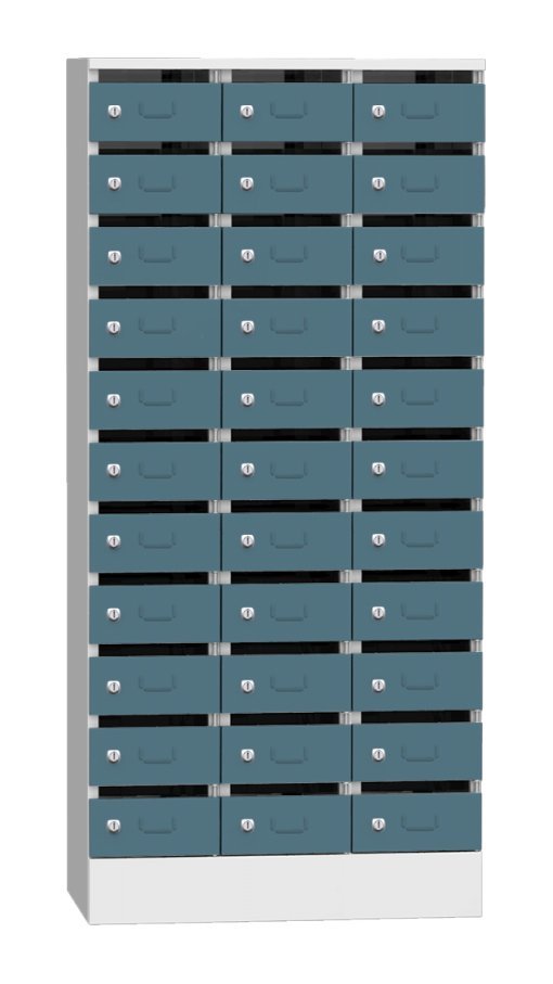 The cabinet is intended for sorting mail, documents or other valuables. Separately lockable boxes for cyl. lock or padlock closure. Height 1950 x width 900 x depth 500mm, 33 compartments with throw. Body color light gray RAL 7035.