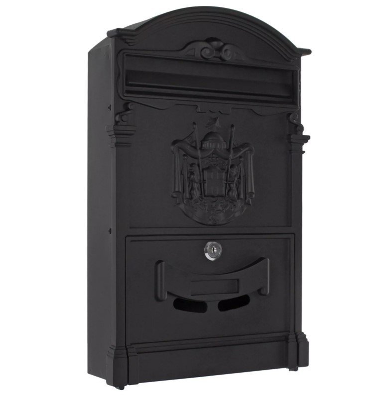Metal mailbox with historical motif, for indoor and outdoor use, front opening. Height 410 x width 260 x depth 90 mm. Color anthracite.