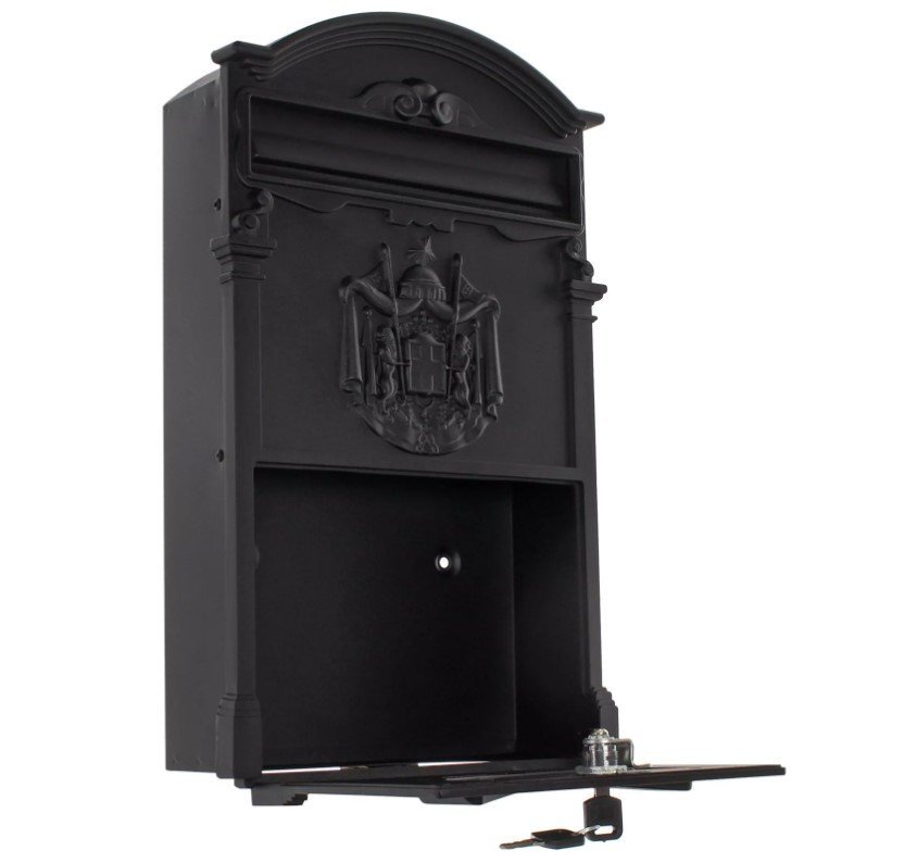 Metal mailbox with historical motif, for indoor and outdoor use, front opening. Height 410 x width 260 x depth 90 mm. Color full description and parameters