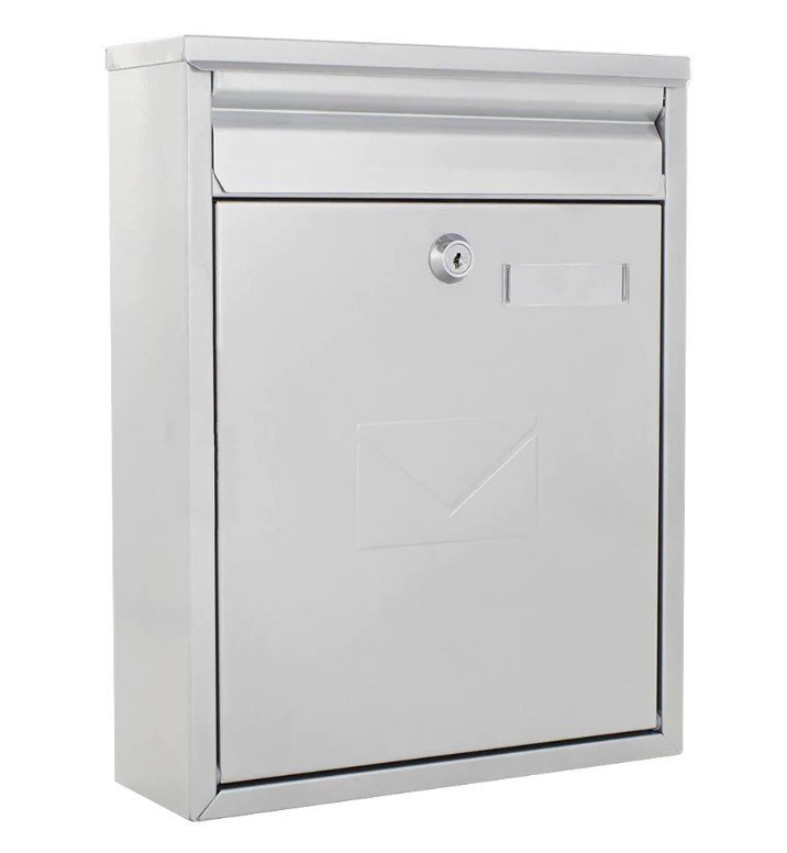 Mailbox, silver color, front and back throw. Height 320 x width 250 x depth 85 mm. Rectangular surfaces - the box is suitable for full description and parameters