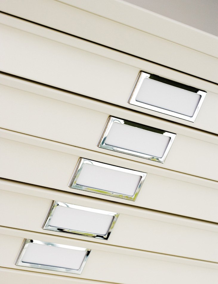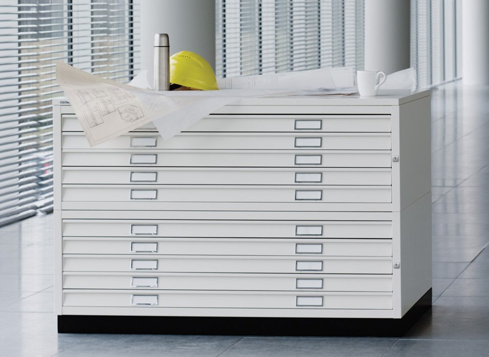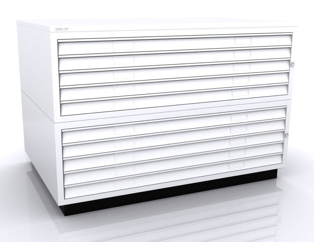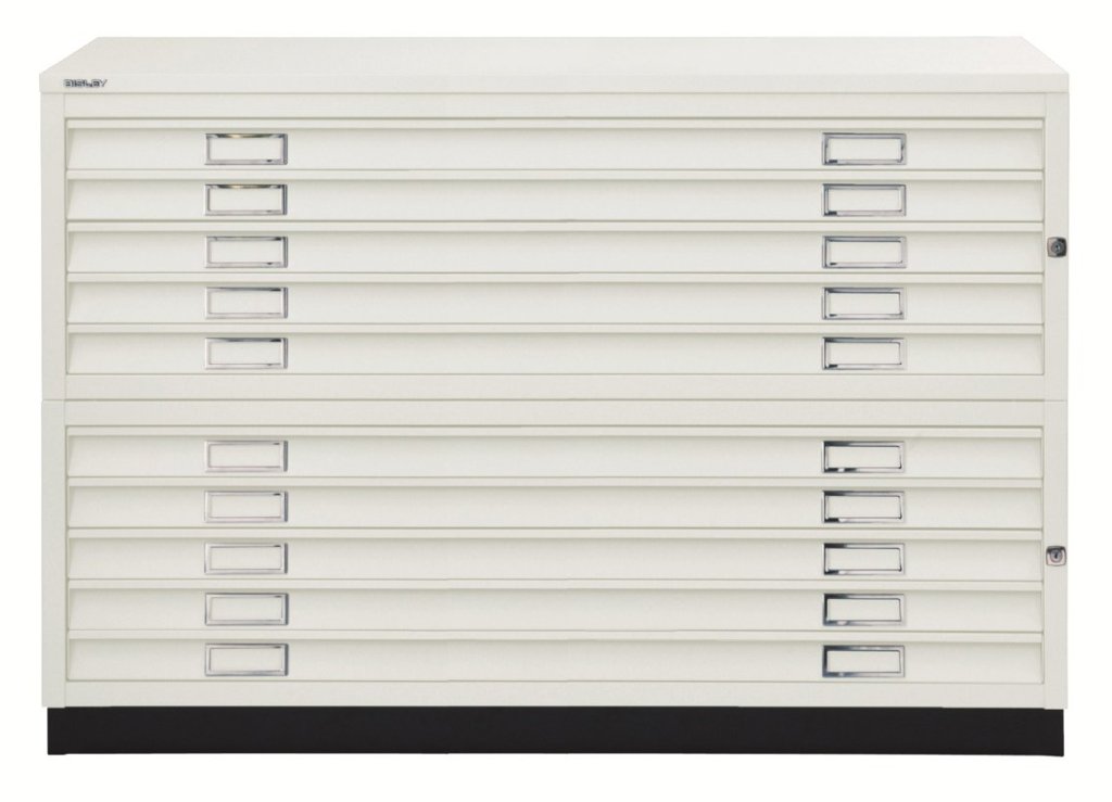 A1 ten-drawer drawing cabinet including top plate and plinth, width 1010, height 914, depth 691 mm. Assembly from two separate five-drawer sections, can be supplemented with a so-called intermediate piece for a total number of 15 drawers.