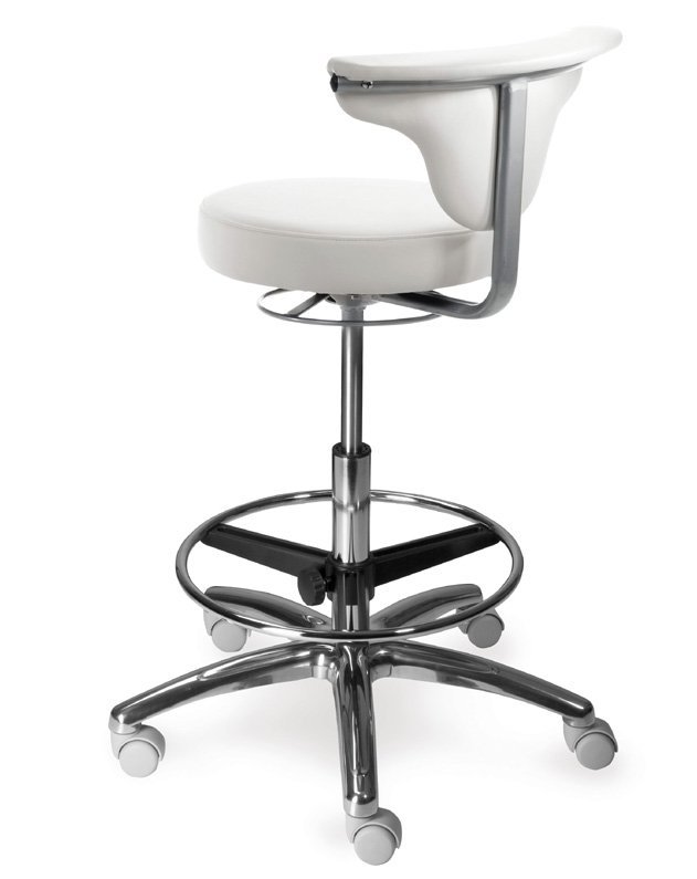 High swivel work chair with leg rest, with a swivel rest around the seat for back and hand support. Silver pearl frame, polished aluminum cross, light gray wheels. Seat height 56-76 cm, circular piston control.
