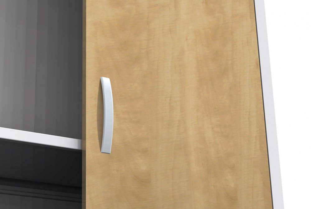 Cabinet with solid doors, height 800 x width 505 x depth 400 mm. Locking on a cylinder lock with a wheelbase mechanism. 1 x adjustable steel shelf (load capacity 60 kg). The possibility of replacing solid doors with doors with glass filling, with wire filling or laminate doors in the shade of beech, birch or cherry. Body color RAL 7035 light gray.