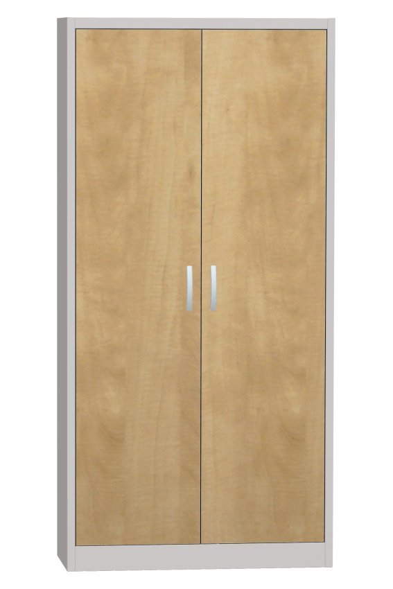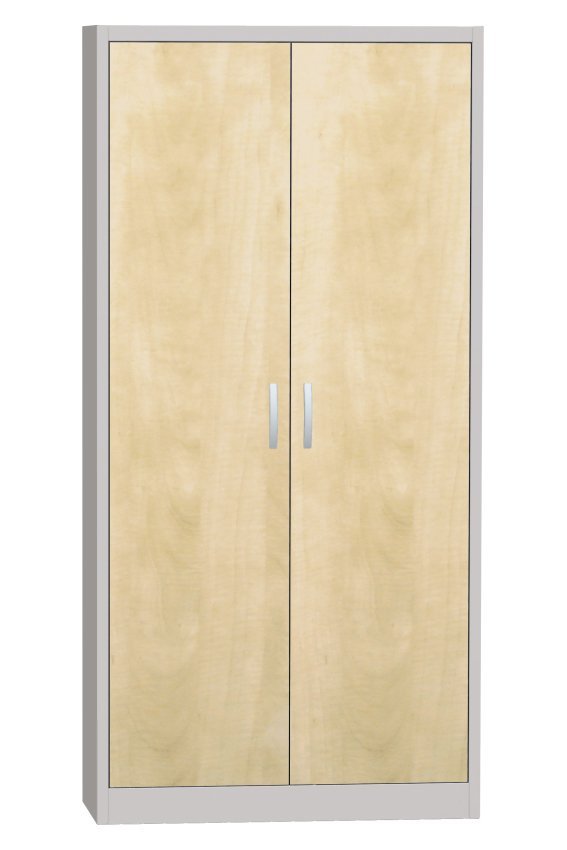 Metal cabinet with laminate doors in beech, birch or cherry pattern. Welded stable body, 4x adjustable metal shelves with a load capacity of 60 kg. Height 1800 x width 800 x depth 400 mm. Metal handle, without lock.