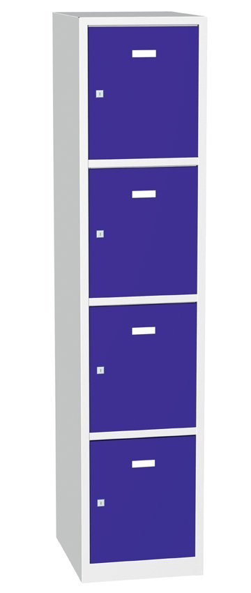 Metal cabinet with lockable boxes, height 1800 x width 400 x depth 500 mm. Key locking or padlock closure. Body color RAL 7035 light gray.