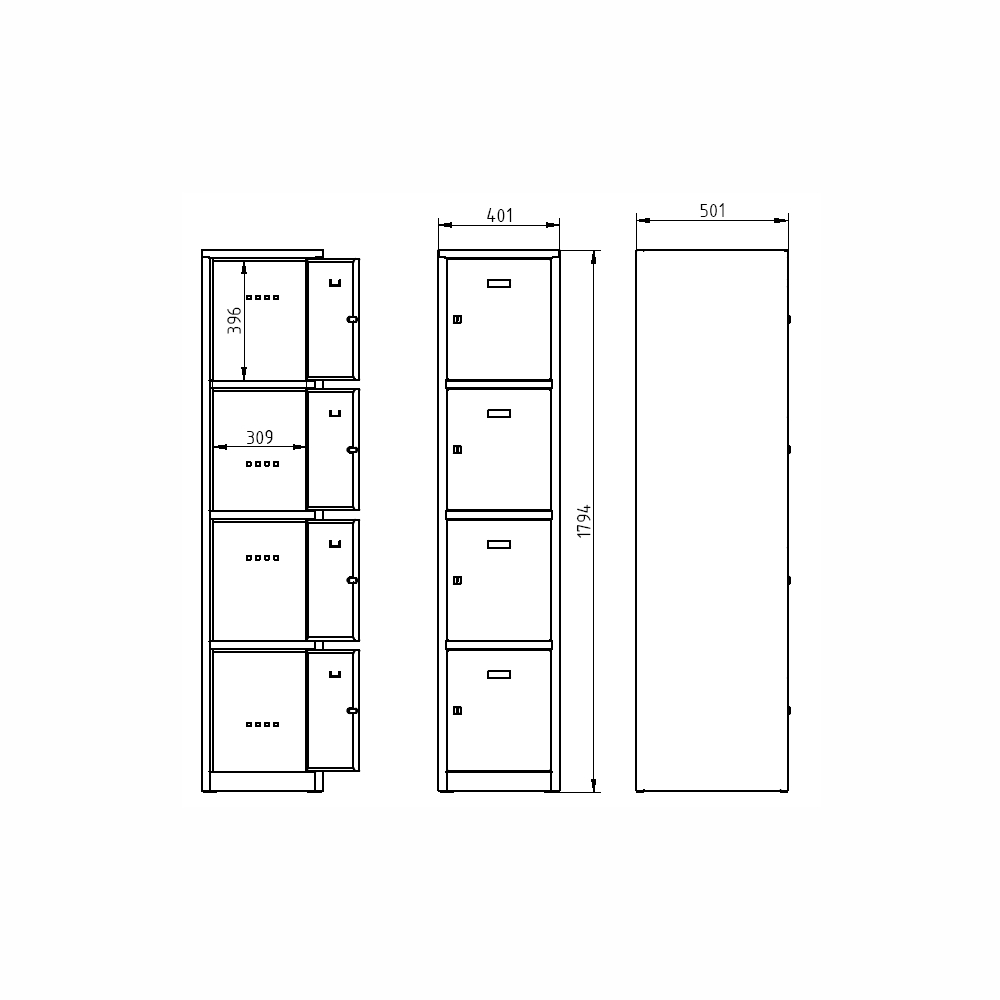 Metal cabinet with lockable boxes, height 1800 x width 400 x depth 500 mm. Key locking or padlock closure. Body color RAL 7035 full description and parameters