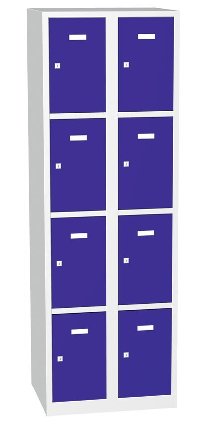 Metal cabinet with lockable boxes, height 1800 x width 800 x depth 500 mm. Key locking or padlock closure. Body color RAL 7035 light gray.
