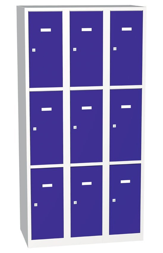 Metal cabinet with lockable boxes, height 1800 x width 900 x depth 500 mm. Key locking or padlock closure. Body color RAL 7035 light gray.