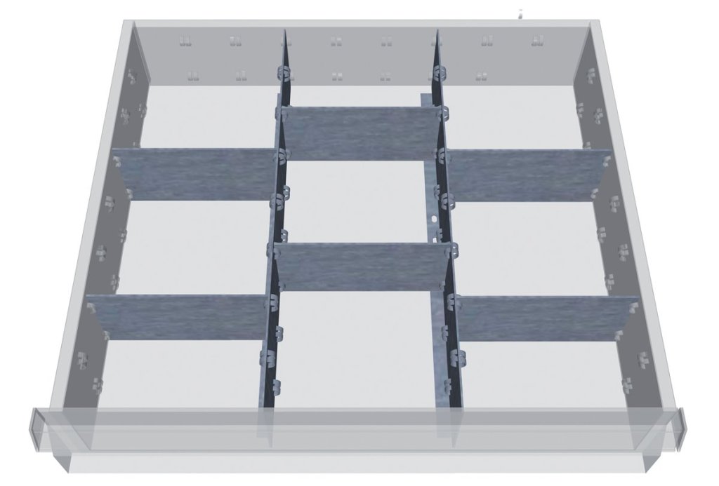 Metal division into 100 mm high drawers. Only suitable for Bedrunka+Hirth service carts with a width of 530 and a depth of 500 mm.