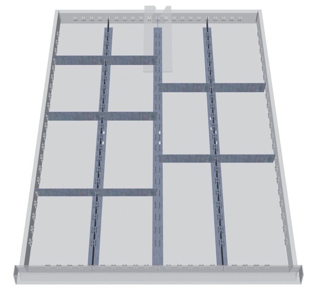 Plastic dividing insert for drawers 100 mm high. Only suitable for Bedrunka+Hirth drawer cabinets with a width of 555 and a depth of 736 mm.