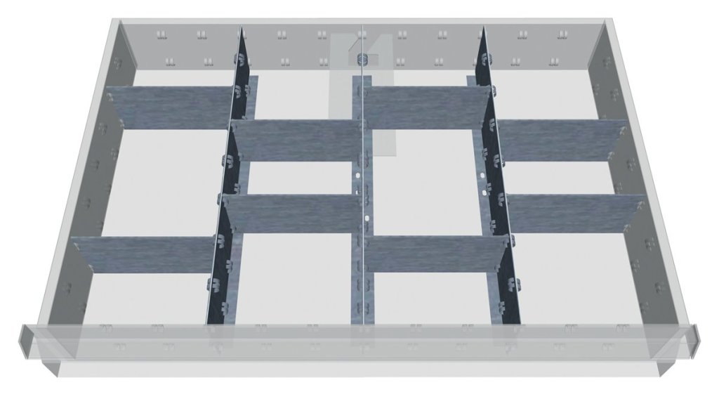 Metal division into 100 mm high drawers. Only suitable for Bedrunka+Hirth service carts with a width of 680 and a depth of 500 mm.